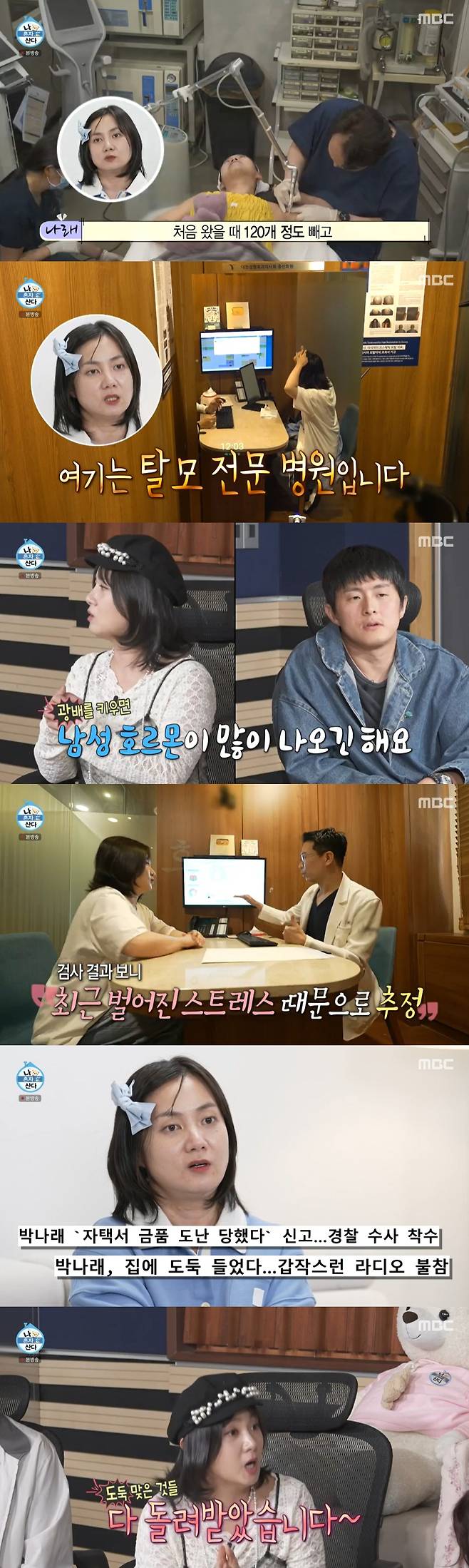 박나래는 스튜디오에서 "지금은 다 해결이 됐다. 새로고침이 됐다. 검찰 송치도 끝났고 도둑맞은 것들을 그대로 다 돌려받아서 스트레스가 없다"라며 현 상황을 설명했다. 박나래는 두피에 주사를 맞는 치료를 받고 탈모 병원을 나섰다.