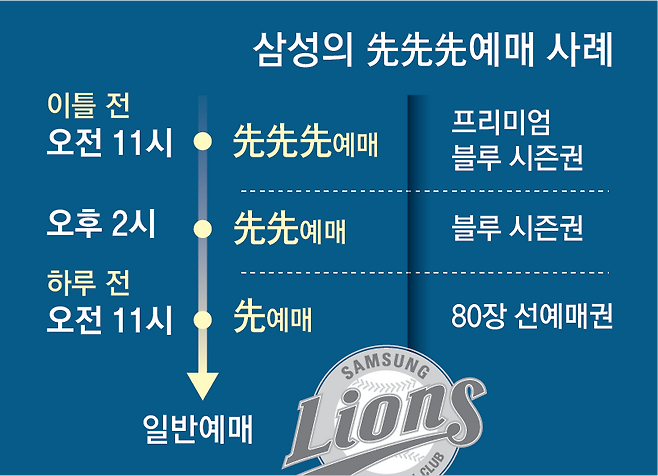 선선선예매 제도를 운영 중인 대표적인 구단은 KT와 삼성이다. KT의 경우 빅또리 회원에게 일반 예매 하루 전 오후 3시부터 먼저 예매할 수 있는 혜택을 제공하고 있다. 이에 앞서 매직 회원은 예매 하루 전 오후 2시, 시즌권 회원은 오후 1시부터 예매가 가능하다. 선예매에서도 1시간 단위로 등급이 세 번이나 나뉜 것. 티켓이 간절한 팬들의 입장에선 1시간은 하늘과 땅 차이다.