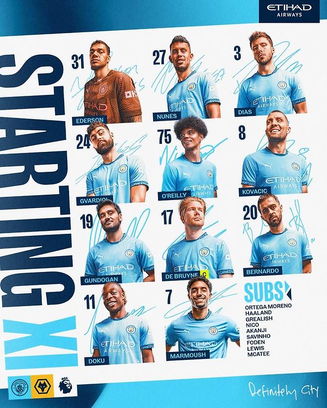 UCL 티켓을 확보하기 위해 맨시티는 안방에서 울버햄튼을 상대로 총력전을 펼친다. 오마르 마르무시를 비롯해 베르나르두 실바, 케빈 더 브라위너, 제레미 도쿠, 귄도안, 마테오 코바치치, 마테우스 누네스, 후벵 디아스, 요슈코 그바르디올, 니코 오라일리, 골키퍼 에데르송이 선발 출격한다.