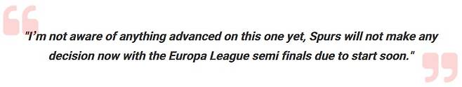 이적시장 전문가 파브리지오 로마노 기자는 1일(이하 한국시간) 영국 매체 '기브미스포츠'를 통해 "토트넘과 니코 코바치 감독 사이에는 아무런 진전이 없다. 구단은 2024/25 유럽축구연맹(UEFA) 유로파리그(이하 UEL) 4강전이 진행되는 동안 포스테코글루의 경질 여부를 속단하지 않을 것"이라고 보도했다.