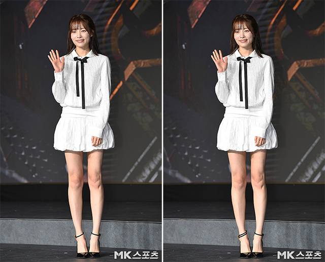 이날 제작발표회에서 윤소희는 블랙 리본 타이를 포인트로 한 화이트 셔츠에 화이트 미니 스커트를 매치해 러블리한 분위기를 표현했습니다.