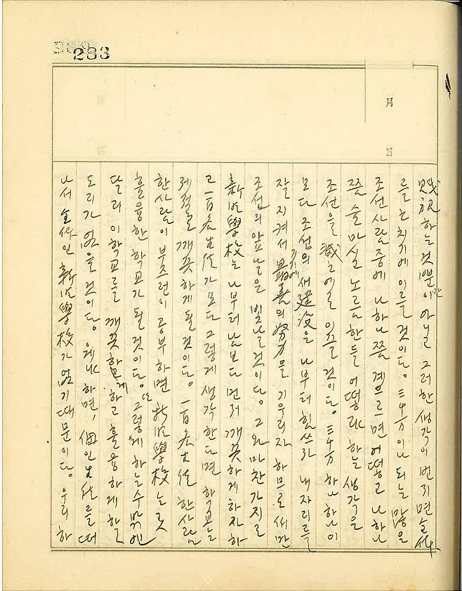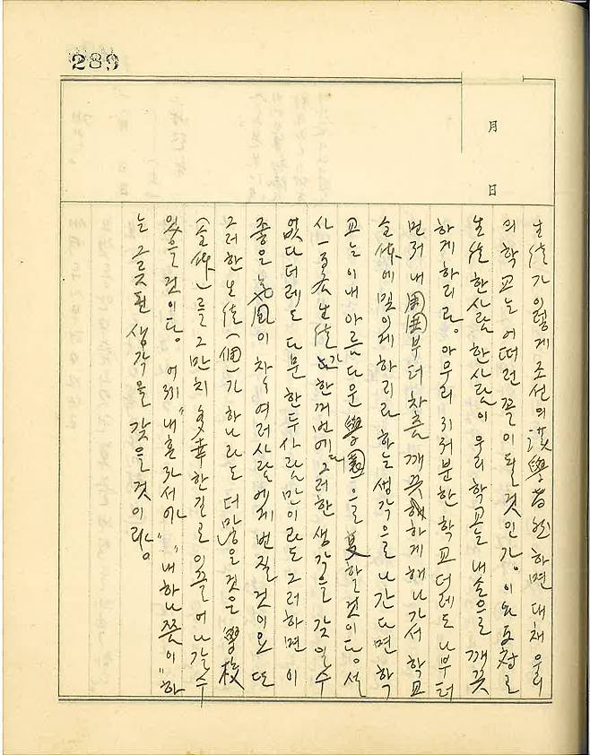 즉 우리들은 스스로 의식지 못하고 사회의 의표(儀表)가 되는 경우가 있다. 너희들은 언제든지 일개 미미한 여생도라고만 생각지 말라. 너희들이 학교에 오가는 길에서나 혹은 집에서 아무렇지도 않게 여기고 하는 거동이 모두 사회의 환시(環視) 속에 있나니 대수롭지 않은 일이 너희들의 일생에서나 또는 이 신명학교에서나 또 혹은 조선 여성에 있어서 지대한 영향을 끼치는 일이 많고 때로는 치명적인 결과를 초래함을 명기하라. 항상 사회적인 책무를 자각해서 자중자애하라. 이것은 전번 조회시간에 말한 전체(全體)와 개(個)의 문제와도 관련되는 일이다.
