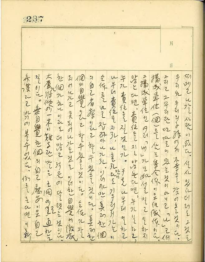 세상에는 흔히 큰 집이 기울어지려 함에 기둥 하나로 버티지 못한다는 말을 쓴다. 나는 이 말을 심히 불유쾌하게 여긴다. 왜냐하면, 조선이 기울어져 가고 조선민족이 그릇된 길을 걷고 있을 때 조선사람 하나하나가 기둥 하나로 버티지 못한다는 생각을 지닌다면 이 큰 집은 대체 누가 지탱해줄 것이며, 지탱해 줄 이가 없다면 그 큰 집의 운명은 끝내 어떻게 될 것인가. 그와 반대로 조선사람 하나하나가 조국과 동포라는 우리의 전체가 기울어지려 하니 그를 구성하는 개인 우리는 그와 운명을 같이 할지라 어찌 안연히 건너편 산의 불 보듯 할 수 있으랴 하고 내 한 기둥이나마 끝까지 이 큰 집을 버티어 보겠다는 생각으로 죽음을 무릅쓰고 어디까지든지 버틴다면 반드시 광란(狂瀾)을 기도(旣倒)에서 돌이킬 수 있을 것이다. 그러한 경우에 남은 다 안연히 좌시하는데 내 혼자 이런들 어쩌리 하는 공리적인 타산을 버리라. 전체의 운명은 결국 이러한 사람이 한 사람이라도 더 많은가 저러한 사람이 한 사람이라도 더 많은가 하는 데 달렸다는 것을 알라.