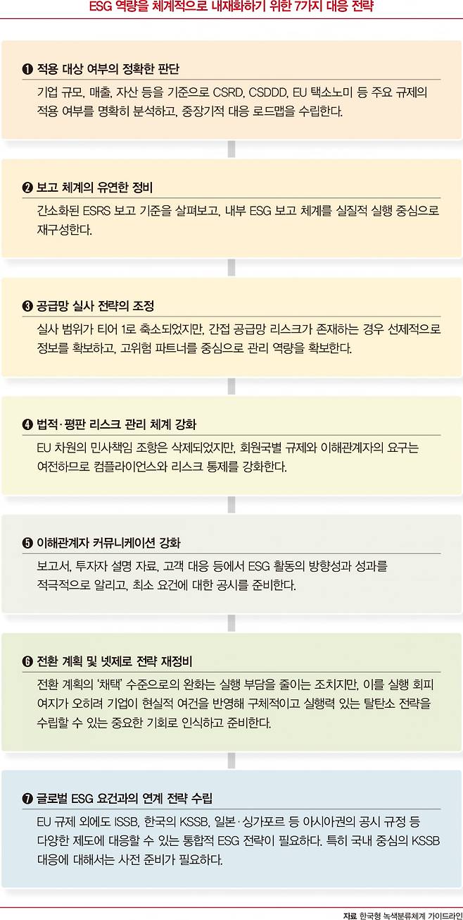 이러한 변화의 흐름 속에서 특히 한국 수출 기업은 ESG 역량을 체계적으로 내재화하기 위해 7가지 전략적 대응 전략(▲적용 대상 여부의 정확한 판단 ▲보고 체계의 유연한 정비 ▲공급망 실사 전략의 조정 ▲법적·평판 리스크 관리 체계 강화 ▲이해관계자 커뮤니케이션 강화 ▲전환 계획 및 넷제로 전략 재정비 ▲글로벌 ESG 요건과의 연계 전략 수립)을 고려해야 한다.