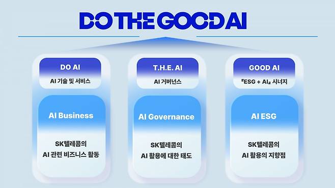 SKT가 새롭게 선보이는 ESG 비전 ‘DO THE GOOD AI’는 크게 3가지 영역 ‘DO AI’, ‘T.H.E. AI’, ‘GOOD AI’으로 구성됐다. ▲AI로 통신과 기술의 경쟁력을 높이면서(DO AI), ▲SKT가 2024년 3월 선보인 AI 거버넌스 ‘T.H.E AI’를 바탕으로 AI의 신뢰성과 안전성을 확보하고(T.H.E. AI), ▲AI로 세상에 긍정적 기여를 하도록 ESG 경영을 추진한다(GOOD AI)는 의미를 담았다.