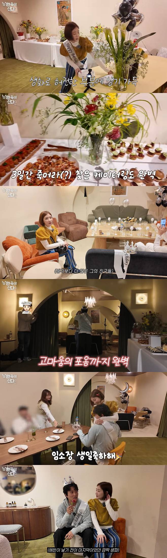 신다은은 임성빈을 위한 깜짝 생일 파티를 준비하며 "(남편) 친구들이 왜 이렇게 많아"라고 투덜대 웃음을 안겼다. 신다은은 케이터링 서비스까지 이용해 서프라이즈 생일 파티를 더욱 풍성하게 꾸몄고 풍선, 생화 꽃도 이곳저곳 배치해 화려한 분위기도 만들었다.
