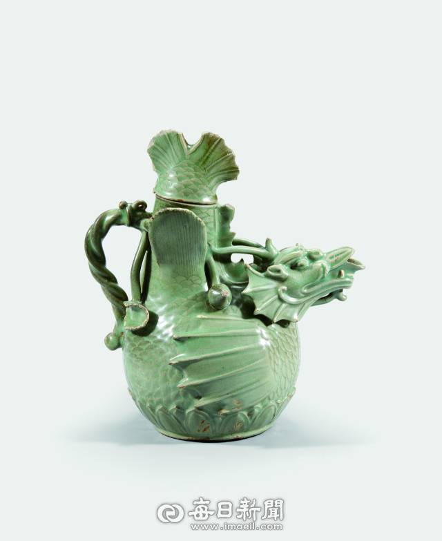 #꼬리를 치켜 올려 전체적으로는 U자 형태이며 몸체는 부풀어 터질 듯한 물고기와 용이 결합된 상상의 동물 어룡(魚龍)은 연꽃 잎사귀들이 조롱박 모양의 주전자 전체를 아름답고 균형감 있게 감싸 안은 모습의 국보 청자 어룡 모습 주전자(12세기).