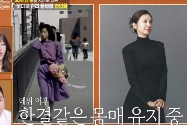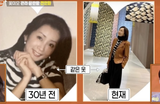 특히 이날 전인화는 “지금 입은 옷도 15년 전 옷”이라며, “실제로 30년 전 옷도 아직 입는다”고 밝혀 모두를 놀라게 했다. 과거 데뷔 초 사진과 현재의 모습이 비교되자, 출연진들은 “몸매와 분위기가 그대로다. 자기관리 정말 대단하다”며 감탄을 쏟아냈다.