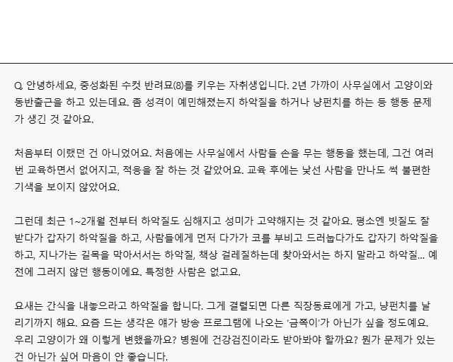 A. 안녕하세요. 반려동물의 행동문제를 과학적이고 체계적으로 치료하는 ‘하이 반려동물 행동 클리닉’의 원장 이우장 수의사입니다. 일단 모든 행동문제가 그렇듯이, 왜 갑자기 변했는지 최대한 원인을 파악할 필요가 있어 보입니다.