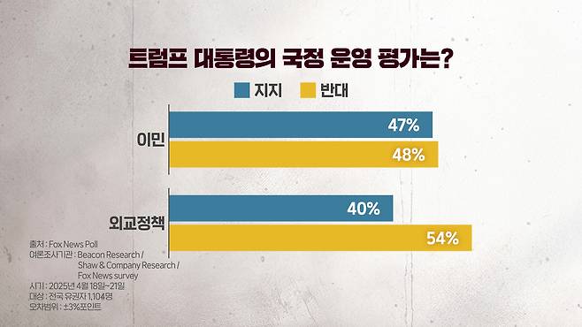 그 외의 숫자들을 보시면요. 이민 정책의 경우 찬성이 47%, 반대가 48%로 찬반이 비슷한 양상을 보이고 외교 정책의 경우 찬성이 40%, 반대가 54%로 반대하는 비율이 더 높았습니다.