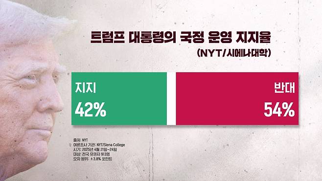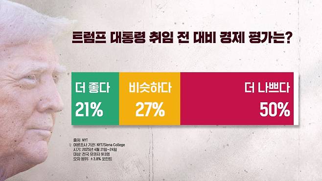 미국의 민심 ② NYT 여론 조사·인터뷰 다음은 뉴욕 타임스의 여론 조사 결과입니다. 뉴욕 타임스가 시에나 대학과 함께 전국 913명을 대상으로 4월 21일부터 24일까지 진행한 설문 조사에 따르면요.