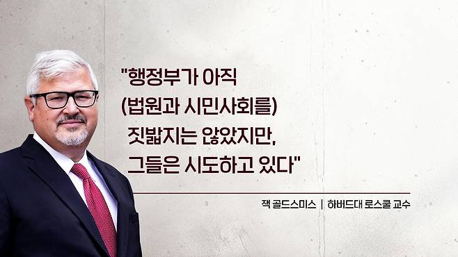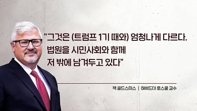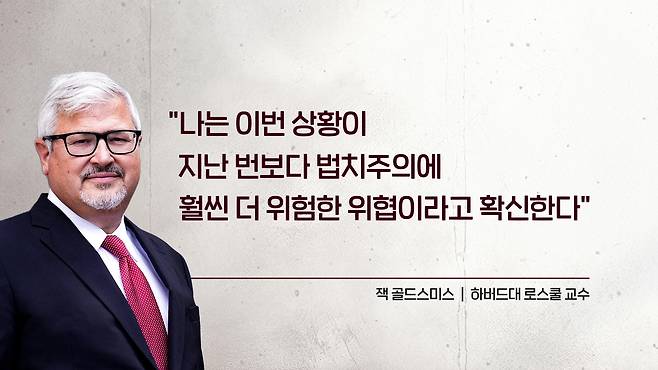 뉴욕 타임스 기사에서 잭 골드스미스 하버드대 로스쿨 교수는 이건 완전히 다른 상황이다. 지금은 사실상 법원과 시민사회만 남아 있다. 행정부가 아직 이들을 완전히 억압하지는 않았지만 분명히 시도를 하고 있다. 자신은 이 상황이 지난번보다, 그러니까 지난 지난 트럼프 1기 행정부보다 훨씬 더 위험한 법치주의 위협이라고 확신한다 이렇게 말을 한 바 있고요.