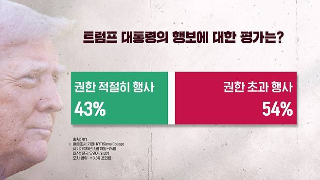 전체 응답자 중의 54%는 트럼프 대통령이 자신이 사용할 수 있는 권한을 초과하고 있다라고 답했습니다.