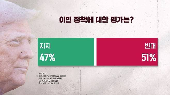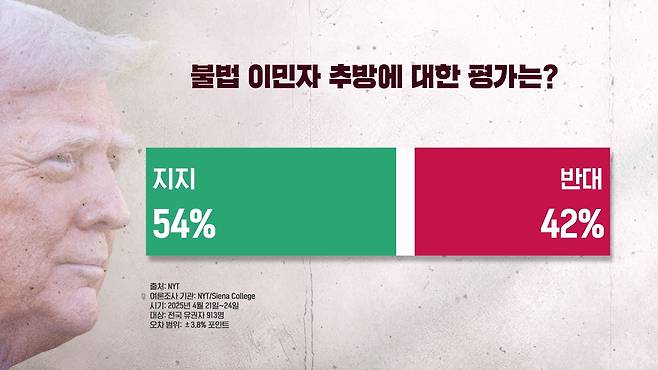 트럼프 대통령의 대량 추방 정책은 여전히 대중의 지지를 받고 있는 것으로 조사가 됐는데요. 전체 응답자의 54%가 지지한다 이렇게 답을 했습니다.