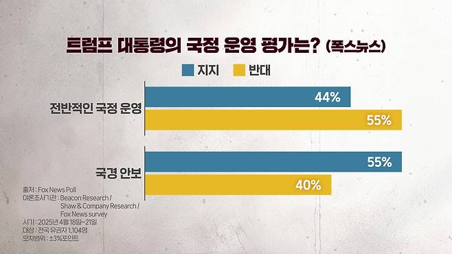 트럼프 대통령의 지지율은 44%입니다. 특히 트럼프 대통령은 국경 안보 부문에서 55%의 찬성 비율을 받으면서 가장 높은 평가를 받고 있었는데요. 사실 과반이 넘은 이 숫자는 그의 평가가 긍정적인 영역에 있는 유일한 사안이었습니다.