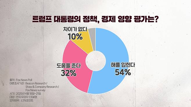 트럼프 대통령의 정책이 경제에 이로운지 또는 해를 입히는지 등을 묻는 질문에는 54%가 경제에 해를 입힌다라고 답했고요. 32%가 경제에 도움을 준다고 답했습니다. 그리고 10%는 별 차이가 없다고 답했습니다.