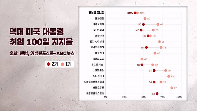 지금 보시는 화면은 워싱턴 포스트가 구성한 자료인데요. 트럼프 대통령의 지지율이 역대 다른 대통령들의 취임 100일 기준의 지지율보다 낮은 것을 보실 수가 있습니다. 물론 트럼프 대통령은 가짜 뉴스다라고 말을 했습니다.