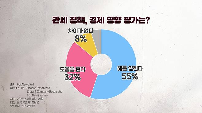 더 세부적으로 관세의 영향력에 대해서 어떻게 생각하느냐라고 물었는데요. 55%가 경제에 해를 입힌다고 답했고, 32%만 관세가 경제에 이롭다라고 답했습니다.