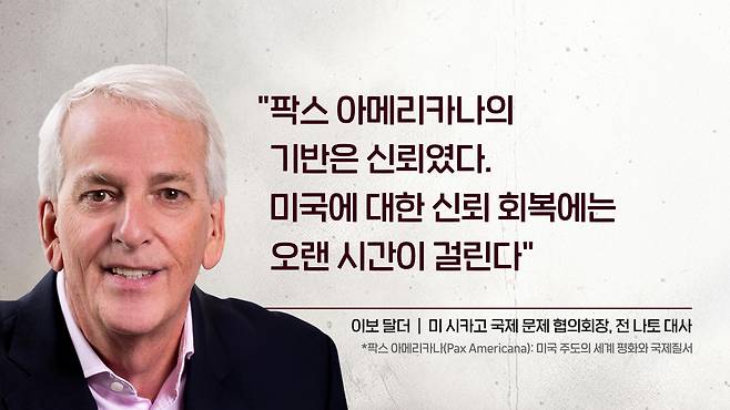 시카고 국제 문제 협의회장이자 전 나토 대사는 가디언지에다가 이렇게 이야기를 했습니다. 80여 년간의 미국 외교 정책이 완전히 뒤바뀌었다. 그리고 팍스 아메리카나의 기반은 신뢰였는데 미국에 대한 신뢰 등을 회복하는 데는 오랜 시간이 걸린다. 이렇게 말을 했습니다.
