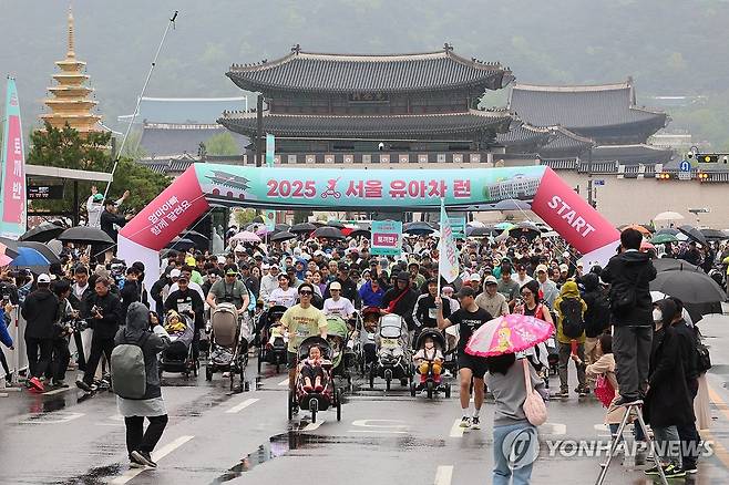 (서울=연합뉴스) 이정훈 기자 = 3일 서울 광화문 광장에서 열린 '2025 서울 유아차 런'에 참가한 부모들이 유아차를 밀며 도착지인 서울광장을 향해 달리고 있다. 2025.5.3
