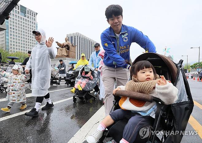 (서울=연합뉴스) 이정훈 기자 = 3일 서울 광화문 광장에서 열린 '2025 서울 유아차 런'에 참가한 부모들이 유아차를 밀며 도착지인 서울광장을 향해 달리고 있다. 2025.5.3