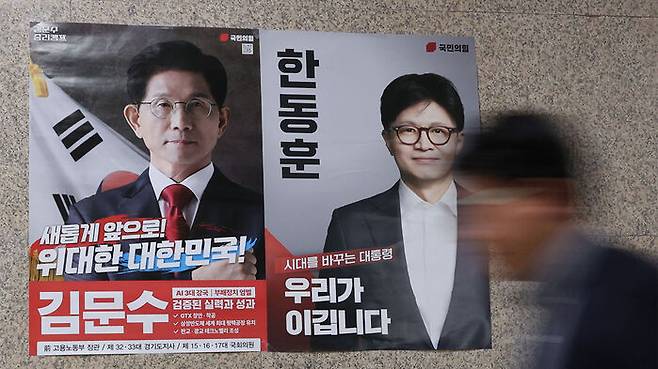 ▲ 지난달 30일 서울 여의도 국회 국민의힘 사무실 앞 복도에 대선 최종 경선에 오른 김문수·한동훈 후보의 벽보가 붙어 있다. (사진=연합뉴스)