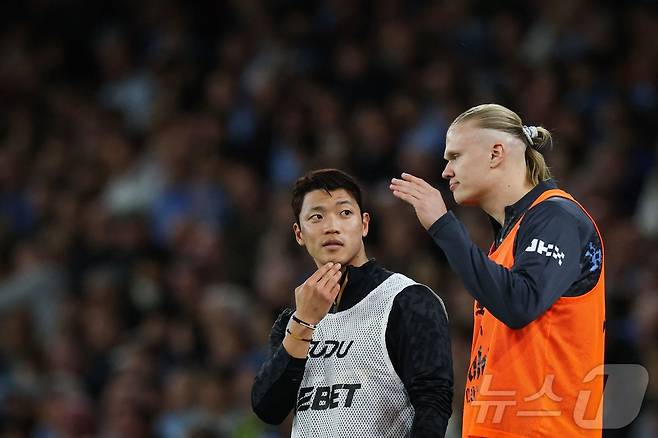 (맨체스터 AFP=뉴스1) 우동명 기자 = 울버햄프턴의 황희찬이 2일(현지시간) 영국 맨체스터의 에티하드 스타디움에서 열린 프리미어리그 맨체스터 시티와 경기 중 맨시티의 엘링 홀란과 얘기를 하고 있다. 2025.05.03
