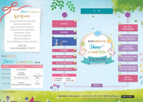 제103회 어린이날을 기념하는 행사가 곳곳에서 열리는 가운데 제주시는 한라체육관 '대축제', 서귀포시는 공천포전지훈련센터 다목적체육관에서 '큰잔치'를 개최한다.