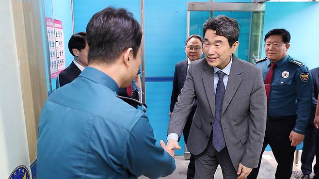 ▲ 이주호 대통령 권한대행 부총리 겸 교육부 장관이 3일 서울 광진경찰서 화양지구대를 방문해 연휴기간 대비 치안 대책을 청취한 뒤 경찰 근무자들을 격려하고 있다.