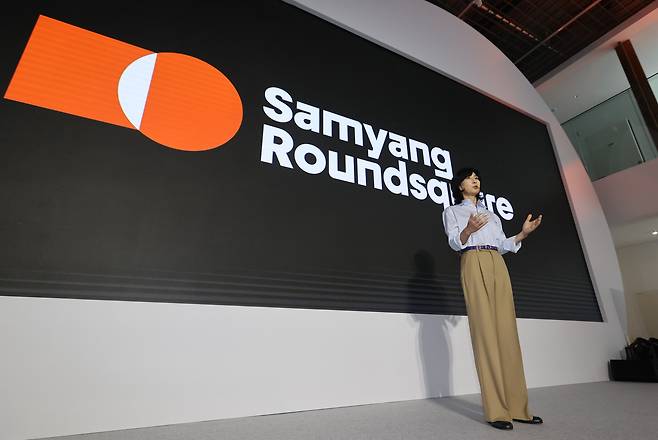 | ▲ 2023년 9월 14일, 김정수 삼양라운드스퀘어 부회장이 서울 종로구 익선동 누디트 익선에서 열린 삼양라운드스퀘어 삼양라면 60주년 비전선포식에서 기조연설을 하고 있다. |