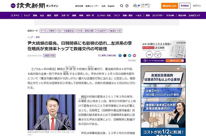 | ▲ 전직 대통령 윤석열 씨의 파면 소식을 빠르게 보도한 지난 4일 자 요미우리신문. '윤 대통령 파면, 한일관계에도 영향 우려... 좌파계의 이재명 씨가 지지율 1위로 정권교체 가능성'이라는 헤드라인을 뽑았다. |