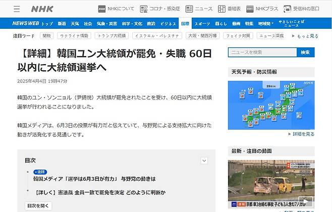 | ▲ 지난 4월 4일, 전직 대통령 윤석열 씨의 파면 당시 일본 NHK 뉴스. '한국 윤 대통령이 파면·실직 60일 이내에 대통령 선거'라는 헤드라인을 달았다. |
