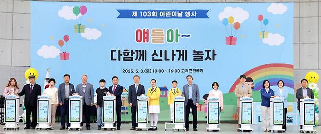 [서울=뉴시스] 추상철 기자 = 장인홍(왼쪽 여덞번째) 구로구청장이 3일 서울 구로구 고척근린공원에서 열린 '제103회 어린이날 행사'에서 내외빈과 어린이와 함께 개막 축하 퍼포먼스를 하고 있다. (사진= 구로구 제공) 2025.05.03. photo@newsis.com *재판매 및 DB 금지