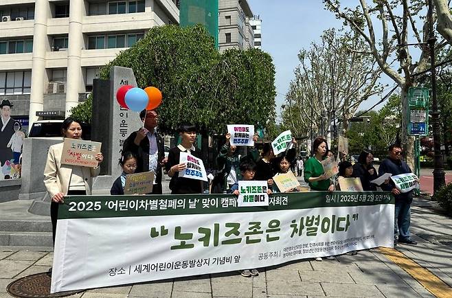 어린이날을 앞두고 시민단체 활동가들과 회원들이 2일 오전 서울 종로구 '세계어린이운동발상지 기념비' 앞에 모여 '노키즈존(No Kids Zone)은 차별'이라며 노키즈존 반대 캠페인을 시작한다고 밝혔다.