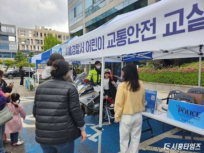| ▲ 경찰 오토바이도 타보고 시청 주차장엔 체험 위주의 각종 부스들이 마련돼 어린이와 가족을 반겼다. 어린이들이 시흥경찰서가 준비한 싸이카를 타보고 있다. |