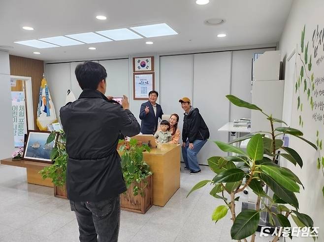 | ▲ 시장실에서 한 컷 3일 임병택 시흥시장이 시장실을 찾은 어린이를 시장석에 앉히며 가족들과 기념 촬영을 하고 있다. |