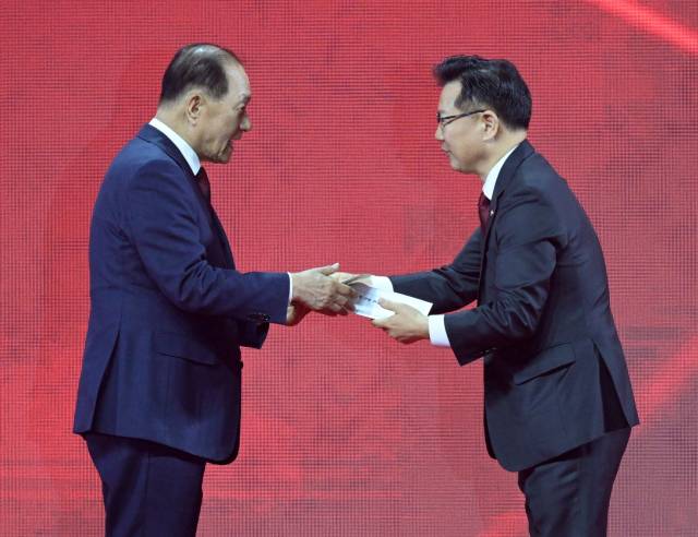 황우여 국민의힘 선거관리위원장이 3일 경기 고양시 일산 킨텍스에서 열린 국민의힘 제5차 전당대회에서 이양수 사무총장으로부터 투표결과 및 여론조사 결과를 전달받고 있다.