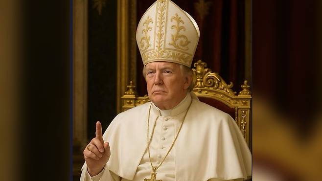 인공지능으로 생성한 것처럼 보이는 이 사진에서 트럼프 대통령은 교황이 입는 흰색 예복에 금색 십자가 목걸이를 걸고 있고 오른쪽 집게손가락은 하늘을 향하고 있습니다.
