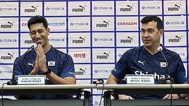 ▲ 지난달 이사나예 라미레스 남자배구 대표팀 감독(왼쪽)과 페르난도 모랄레스 여자배구 대표팀 감독이 기자회견을 하고 있다.