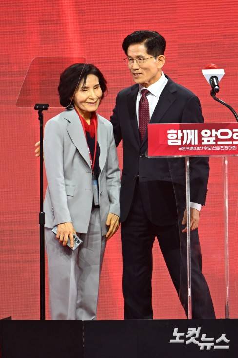 3일 경기도 일산 킨텍스에서 열린 국민의힘 제21대 대통령 선거 후보 선출을 위한 제5차 전당대회에서 대선 후보로 선출된 김문수 대선 후보가 부인 설난영 여사를 소개하고 있다.