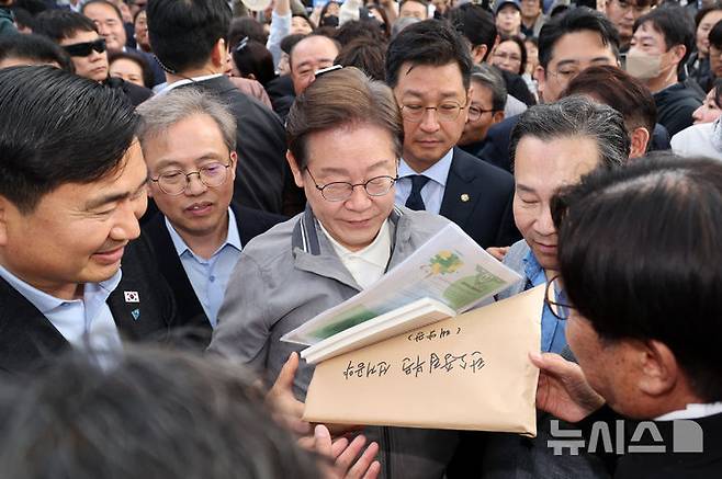 [삼척=뉴시스] 조성우 기자 = 민심을 청취하는 '경청 투어'에 나선 이재명 더불어민주당 대선후보가 3일 강원도 삼척시 삼척해수욕장 인근에서 환경시민단체 관계자로부터 대선 공약 요구 자료를 받고 있다. 2025.05.03. xconfind@newsis.com