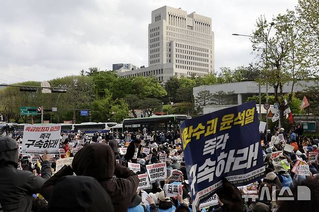 [서울=뉴시스] 최동준 기자 = 촛불행동이 3일 서울 서초구 대법원 인근에서 집회를 열고 대법원 규탄, 대선개입 중지를 촉구하고 있다. 2025.05.03. photocdj@newsis.com