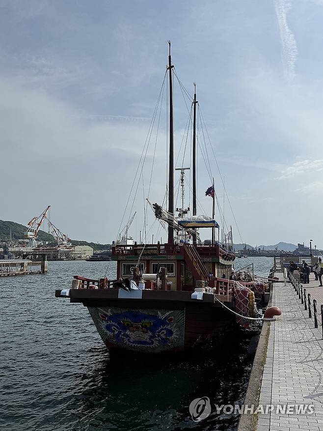 (서울=연합뉴스) 국립해양유산연구소가 재현한 조선통신사선이 3일 일본 히로시마현 구레(吳) 항구에 입항한 모습. 조선시대 한일 교류의 상징이었던 조선통신사가 탄 배를 재현한 이 선박은 오사카까지 항해할 예정이다. 2025.5.3 [국립해양유산연구소 제공. 재판매 및 DB 금지]
