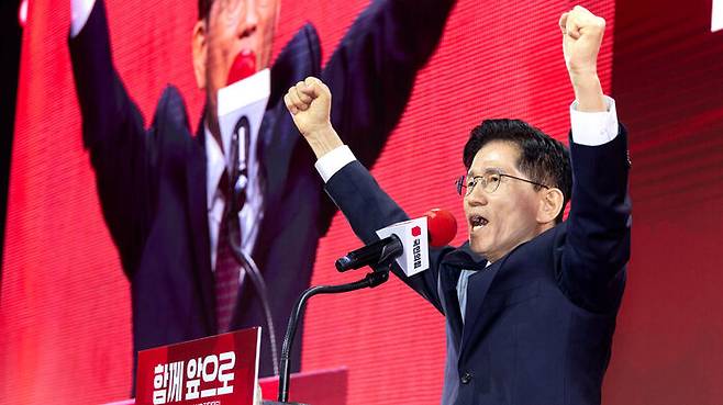 ▲ 국민의힘 대선 후보로 선출된 김문수 후보가 3일 경기 고양시 킨텍스에서 열린 국민의힘 전당대회에서 수락 연설을 하고 있다.