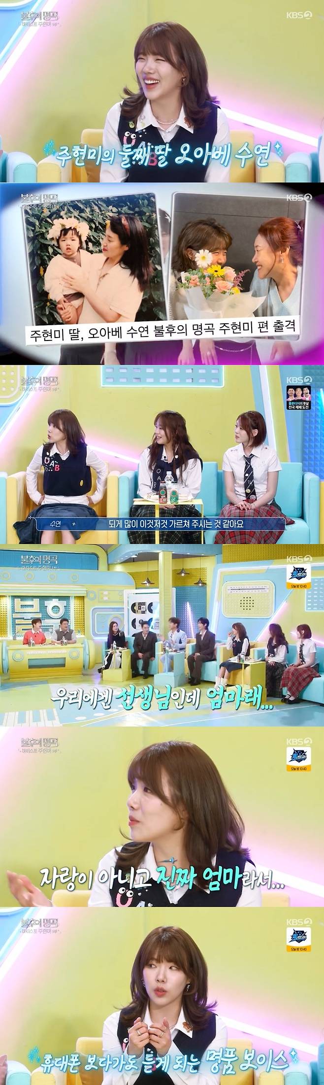 홍경민은 "엄마가 옆에서 노래 부르면 어릴 때도 좋았냐"고 물었고 수연은 "그렇다. 휴대폰 하다가도 가만히 듣게 된다"고 답했다.