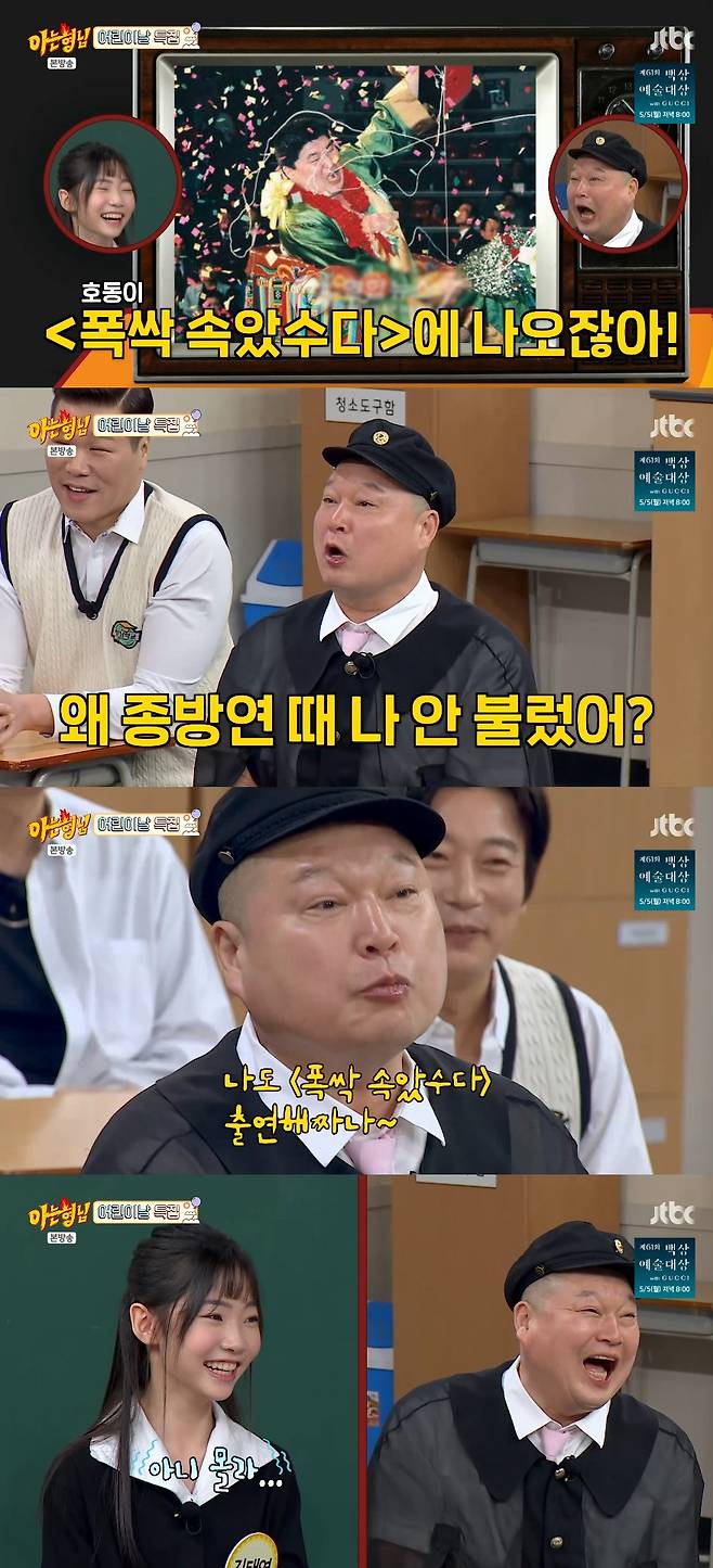 이날 넷플릭스 '폭싹 속았수다'에서 어린 애순을 연기했던 김태연과 어린 관식을 연기한 이천무의 등장에 이수근은 "너 호동이 못 봤냐. 제주도 공항 앞에 서 있다"라며 장난을 쳤다.