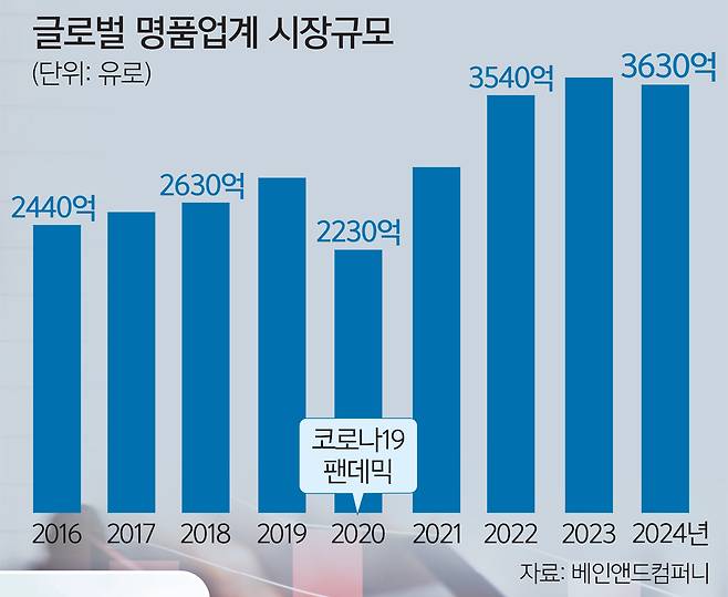 명품업계의 하락세는 지난해부터 본격화됐다. 글로벌 컨설팅업체 베인앤드컴퍼니가 지난해 12월 낸 보고서에 따르면 2024년 전 세계 개인명품시장 규모는 3630억유로(약 538조원)로 집계돼 2023년의 3690억유로에 비해 2% 감소했다. 의류와 가방, 보석, 화장품 등 개인 명품에 대한 수요 둔화는 코로나19 봉쇄 기간을 제외하면 15년 만에 처음으로 나타는 현상이다. 지속적으로 이어지던 성장 흐름이 꺾인 것이다.