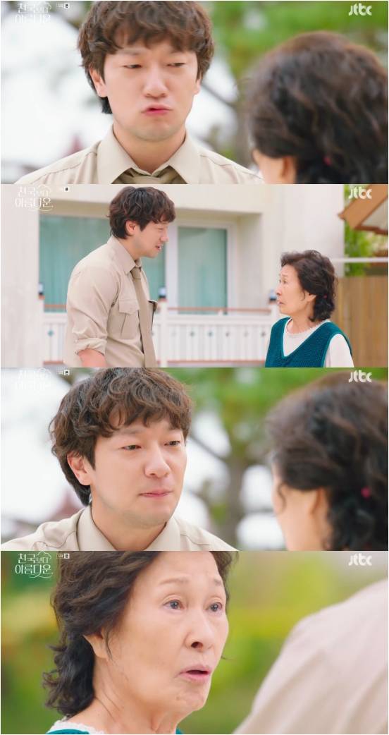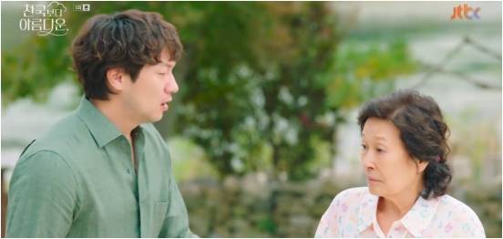 3일 방송된 JTBC 토일드라마 '천국보다 아름다운' 5회에서는 고낙준(손석구 분)이 이해숙(김혜자)이 지옥에 갈까 봐 걱정하는 모습이 그려졌다.