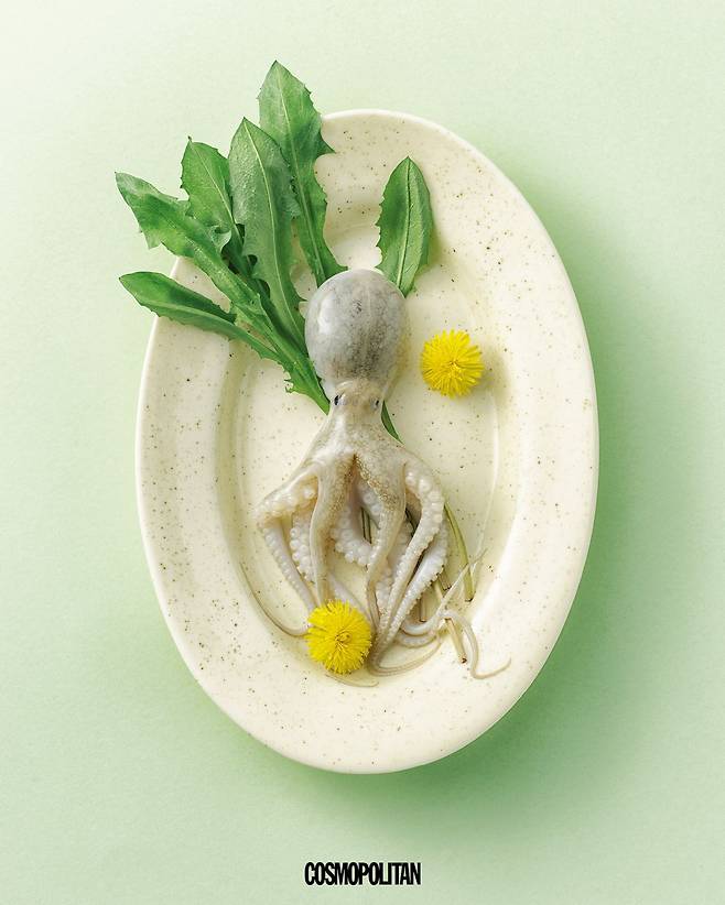 “봄의 맛이라 칭할 만한 제철 재료의 경계가 점점 더 사라지고 있는 것 같아요. 봄의 과일로 통했던 딸기는 이제 겨울부터 나오기 시작하고, 여름 대표 과일이라 여겨졌던 참외도 겨울이 지나 따뜻한 바람이 불기 시작하면 바로 매대에 올라오니까요. 그게 참 아쉽게 느껴지기도 하는데, 그럼에도 여전히 이 계절에만 맛볼 수 있는 재료가 존재한다는 사실에 위안을 받기도 합니다. 알이 가득 들어찬 주꾸미가 바로 그것이죠. 300개에서 많게는 약 500개의 알을 품은 봄의 주꾸미는 톡톡 터지는 독특한 식감과 특유의 고소한 맛을 지녀 입맛을 돋우는 별미로 즐기기 좋아요. 특히 강한 양념이 가미된 볶음 요리보다는 본연의 맛을 온전히 즐길 수 있는 주꾸미 샐러드로 시도해보길 권해요. 양상추, 로메인 등의 채소에 살짝 데친 주꾸미를 올리고 올리브 오일과 레몬, 소금으로 완성한 샐러드 소스를 곁들이면 풍미를 채워주기 충분할 거예요. 이 시기에만 만날 수 있는 민들레잎 나물을 곁들여도 좋겠어요. 루콜라와 비슷한 생김새지만, 쌉싸래한 향이 은은하게 풍겨 더욱 입체적인 맛을 경험해볼 수 있거든요.” by 김보선(푸드 스타일리스트)