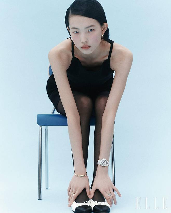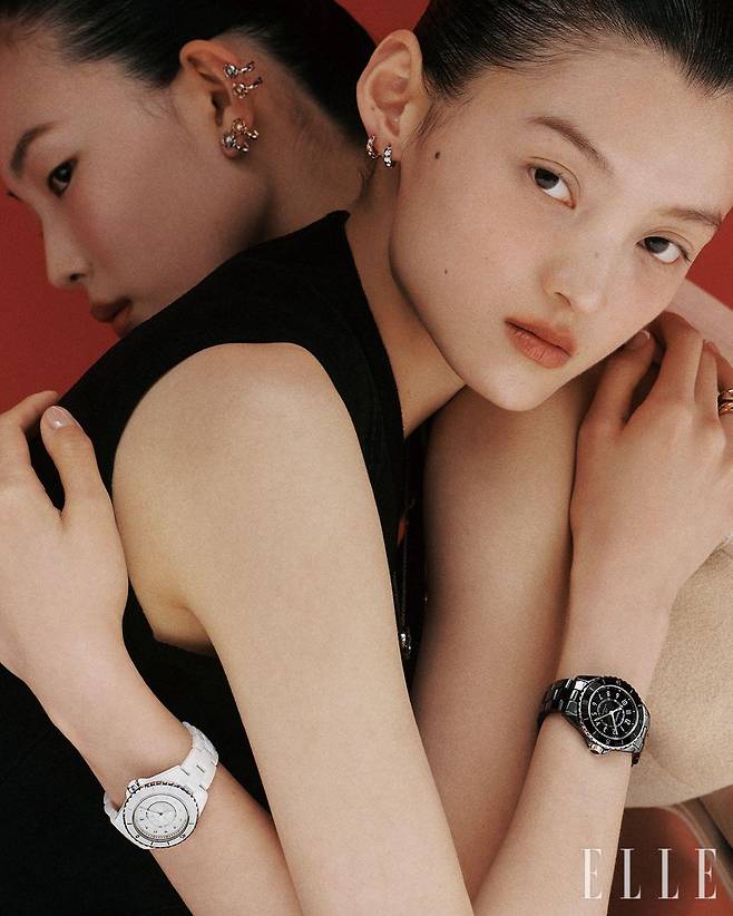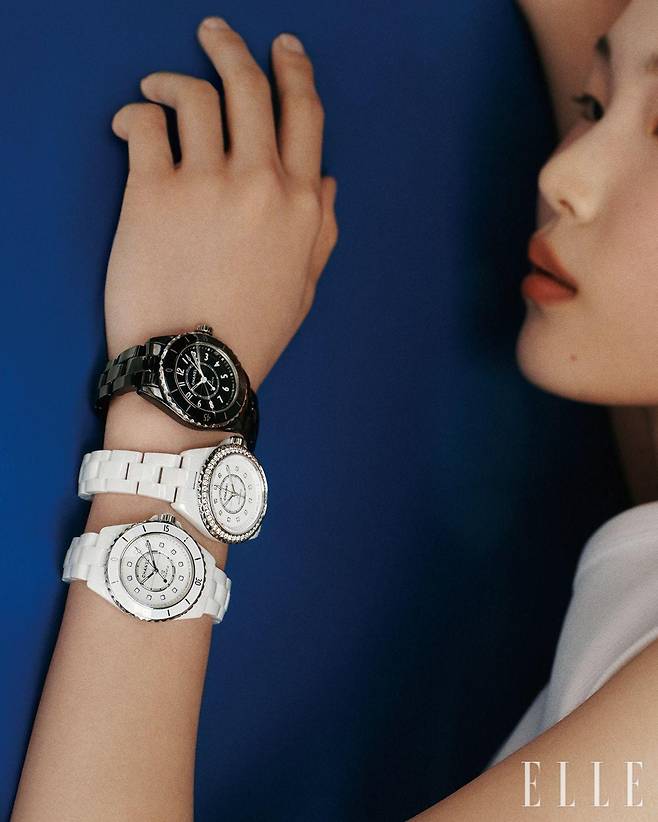 윤서가 착용한 화이트 마더 오브 펄 다이얼에 다이아몬드 세팅 인덱스가 특징인 J12 워치 칼리버 12.2 33mm 워치, 각각 알파벳 C와 O 모티프의 코코 크러쉬 싱글 이어링은 모두 Chanel Watches & Fine Jewelry. 자기가 착용한 블랙 세라믹과 스틸 케이스가 조화를 이룬 J12 워치 칼리버 12.2 33mm, 퀼팅 모티프를 따라 다이아몬드를 세팅한 베이지골드 코코 크러쉬 싱글 이어링, 화이트골드에 다이아몬드를 세팅한 코코 크러쉬 싱글 이어링, 화이트골드 코코 크러쉬 스몰링, 링 모양 펜던트 코코 크러쉬 네크리스는 모두 Chanel Watches & Fine Jewelry.